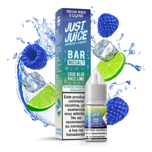 JUST JUICE BLUE SOUR RAZZ LIME NIC SALT 10ML las frambuesas azules despliegan su dulzura característica con un toque ligeramente ácido que estimula el paladar. En la exhalación, la lima entra en acción con su frescura cítrica vibrante, realzando la mezcla y dejando una sensación refrescante y duradera.