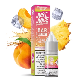 JUST JUICE PEACH PINEAPPLE NIC SALT 10ML el melocotón se presenta desde el inicio con su dulzura suave y textura aterciopelada, envolviendo el paladar con notas cálidas y golosas que evocan fruta madura y carnosa. Le sigue la piña, con su chispa tropical y punto ácido que añade vitalidad al conjunto, equilibrando el dulzor del melocotón y aportando un frescor vivaz que lo convierte en un sabor ideal para el día a día.