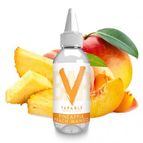 VAPABLE BAR PINEAPPLE PEACH MANGO LONGFILL 40ML Descubre esta deliciosa mezcla de piña, melocotón y mango. Con un sabor muy dulce y lleno de matices. Viene en un formato de 40ml con una capacidad total de 120ml para añadir nicotina y base.
